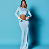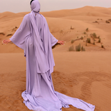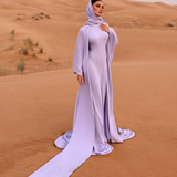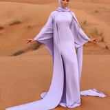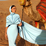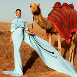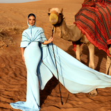 Sky Blue Hijab Dress with Beaded Cape and Train Sky blue mermaid gown with structured silhouette Built in hijab and high neckline fully adorned in tonal beadwork Beaded cape overlay with cascading detailing across shoulders Back cape train flowing from waist Model is...- $1,187.20