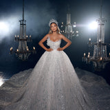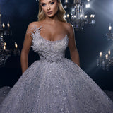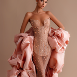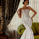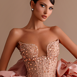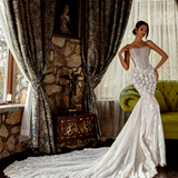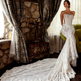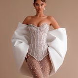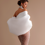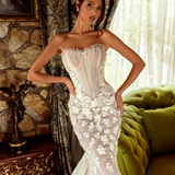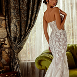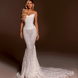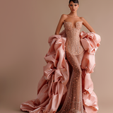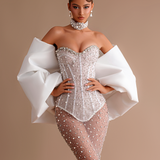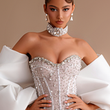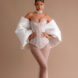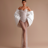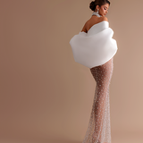 This wedding dress is the epitome of luxury and elegance. The corset-style bodice exudes sophistication, while the right side is adorned with shimmering pearls and intricate accessories, creating a stunning and unique effect. The lower part of the dress is wide and flowing, with...- $4,144.60