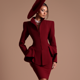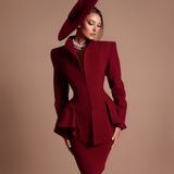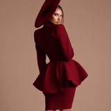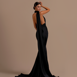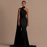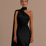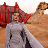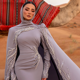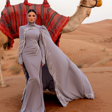 Embellished Mermaid Hijab Gown with High Neck and Flowing Cape Slate gray fitted hijab dress with dramatic mermaid cut Elegant high neckline and long sleeves Embellished with silver branch beading on the bodice, sleeves, and cape Draped cape attached at the shoulders...- $1,399.20