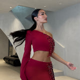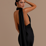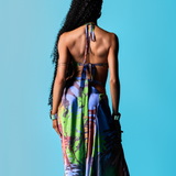 Aqua blue two-piece set Halter-style bikini top with a center floral embellishment Wrap mini skirt with a ruched side tie and asymmetric hem Open back design with a bow tie closure Floral appliqués Model is wearing a size S- $259.70
