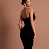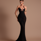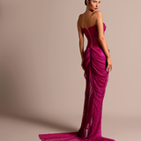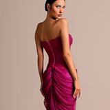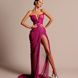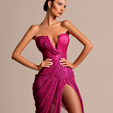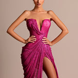 Floor-length fuchsia dress Sweetheart neckline Sleeveless design High thigh slit on the left side Sparkling fabric with sequins Sheer paneling beneath the slit Fitted bodice with a flared bottom Model is wearing a size S- $1,033.50