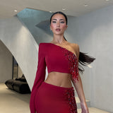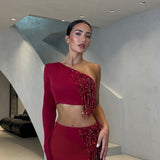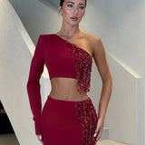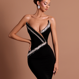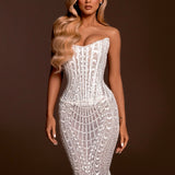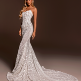 Two-piece mermaid gown Triangle bikini-style top fully embellished with oversized shimmering sequins High waisted skirt cascading into a dramatic mermaid silhouette Sequins layered in different sizes for a dynamic, reflective effect Floor sweeping hemline with a subtle train Model is wearing a size...- $964.60