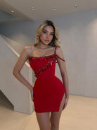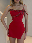 Red mini dress with asymmetric hand-beaded detailing.* Sleek fit with a sharp side slit for a modern edge.* Made for bold, statement moments.