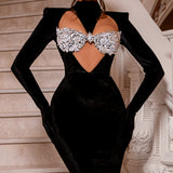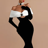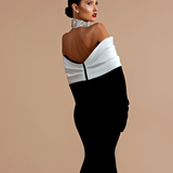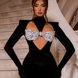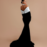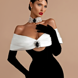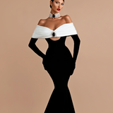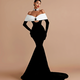 Black and white velvet gown Off the shoulder White overlay with embellishment on the front Front cut out Fitted Waist Long glove sleeves Mermaid Silhouette Floor length Model is wearing a size S- $1,452.20