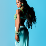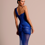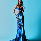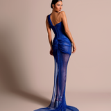 Long dress with deep sapphire, turquoise, and midnight blue Waist cut outs Thin straps Backless with a strap Flowy skirt Model is wearing a size S- $625.40