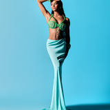 Hand beaded bodice with intricate seashell details Mermaid silhouette Draped beading accents Crisscross strap detailing on the back Floor-length train Tropical floral embellishments Model is wearing a size S- From $137.80
