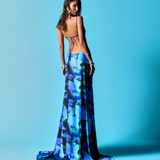 PRE-ORDER ONLY! Two-piece printed ensemble in deep navy and ivory hues Halter style wrap top with asymmetric neckline and open back Flower brooch accent at the hip High-slit maxi skirt with flowy silhouette Model is wearing a size S- $561.80