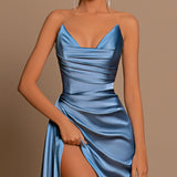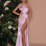 This pastel pink satin dress features a unique and alluring design, with a delicate scarf draped elegantly over one arm, adding a touch of glamour and drama to the overall look. The dress has a beautiful, flowy draping at the bottom, which adds a...- $477.00