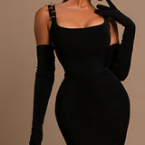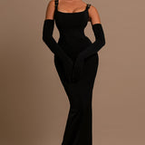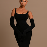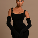 Turn heads and make a statement in this classy yet undeniably sexy black dress. Featuring delicate straps that accentuate the shoulders and collarbone, this dress exudes sophistication and style. The addition of gold detailing adds a touch of glamour and luxury, creating a truly...- $455.80