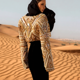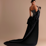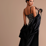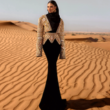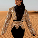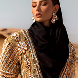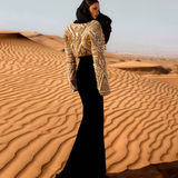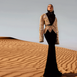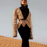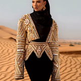 Black Velvet Gown with Gold Embellished Blazer and Hijab Black velvet mermaid gown paired with a heavily embellished gold blazer Hand beaded with crystals and sequins in geometric pattern Structured blazer shoulders and cinched waist Floor length fitted skirt Styled with...- $2,247.20