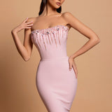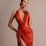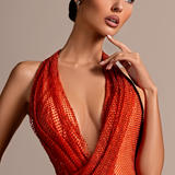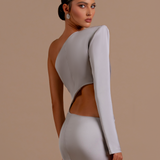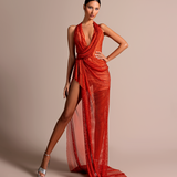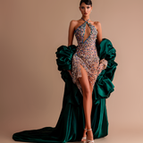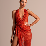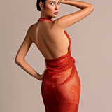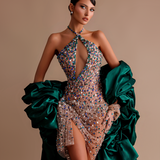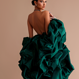 This stunning green satin dress features a flattering corset design and a draping detail on the left side of the hand. The open waist and emphasis on body lines add to its alluring silhouette. The lower part of the dress is elegantly draped with...- $477.00
