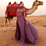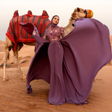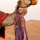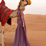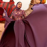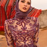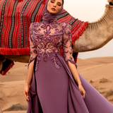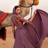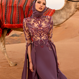 Mauve Embellished Gown with Hijab and Layered Chiffon Skirt Mauve chiffon couture gown with hijab and high neckline Illusion bodice detailed with tonal crystal embroidery and 3D floral appliqués Flowy chiffon overlay skirt Fitted inner silhouette for shape, paired with cape outer skirt ...- $1,547.60