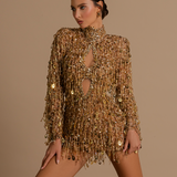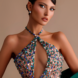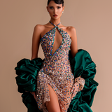 Mini dress with an ombre effect blending soft pink, blue, and peach hues Adorned with intricate crystal and sequin embellishments Side cutout Spaghetti straps and a structured bodice Back zipper closure Model is wearing a size S- $1,303.80