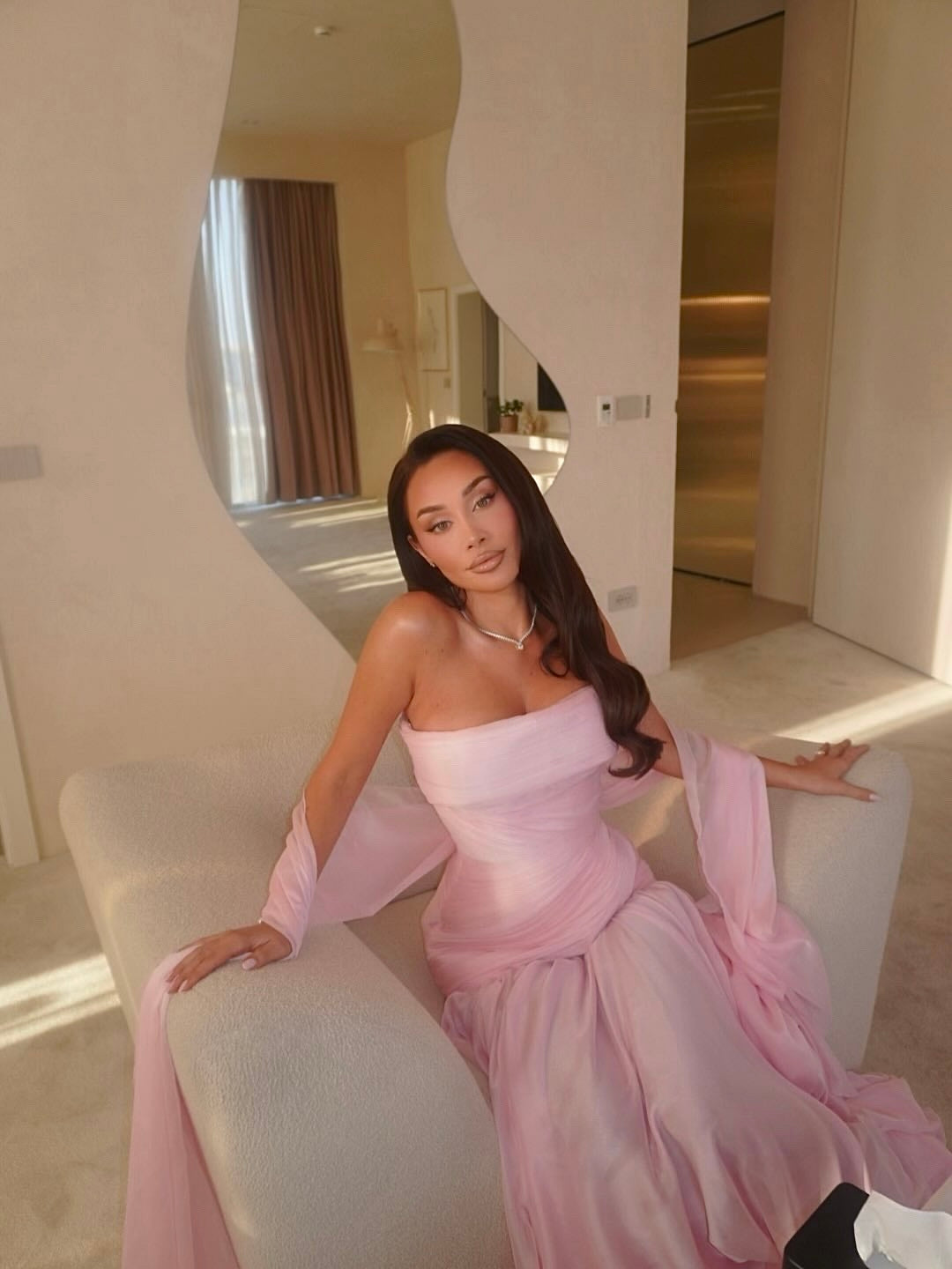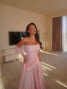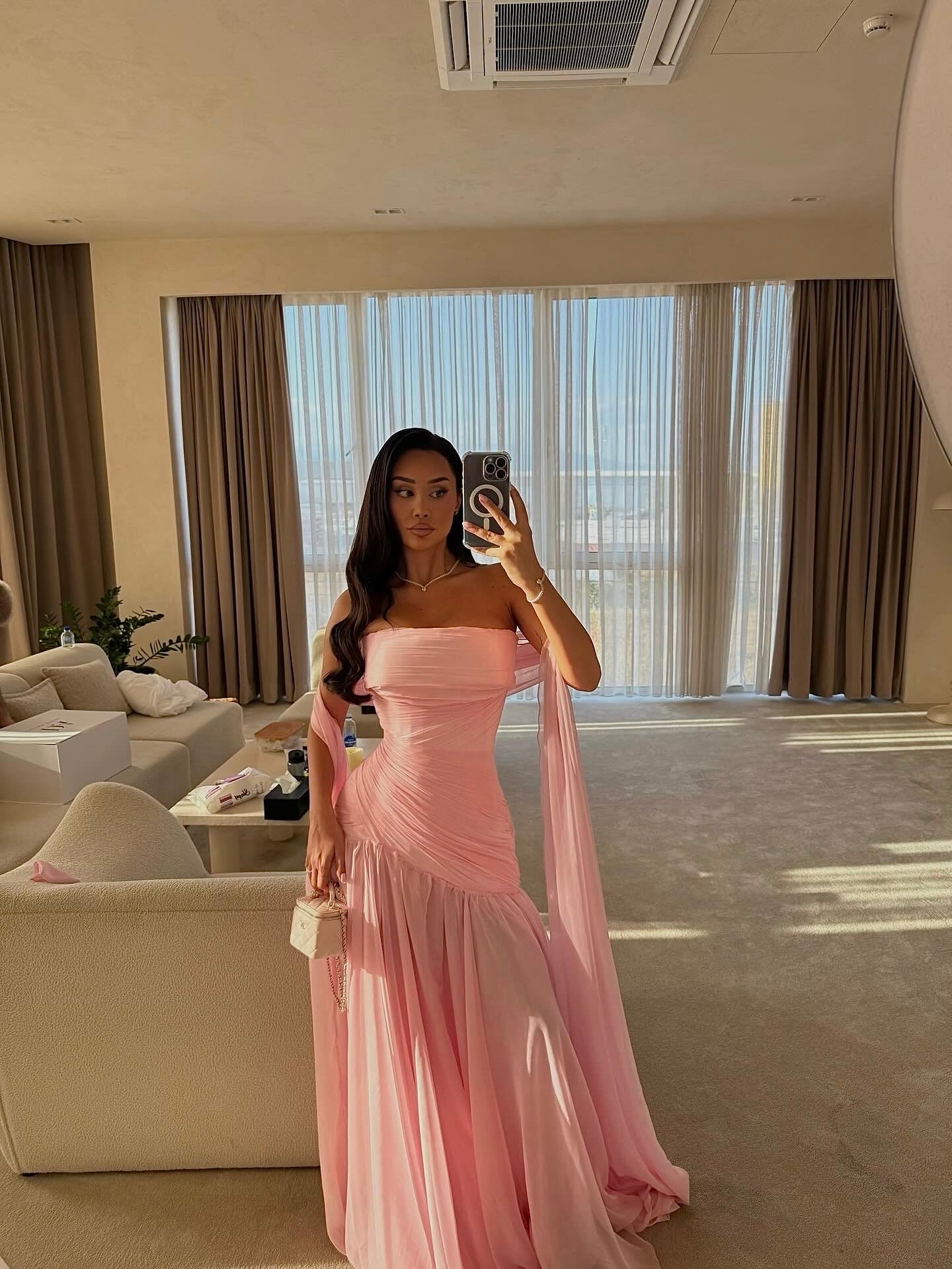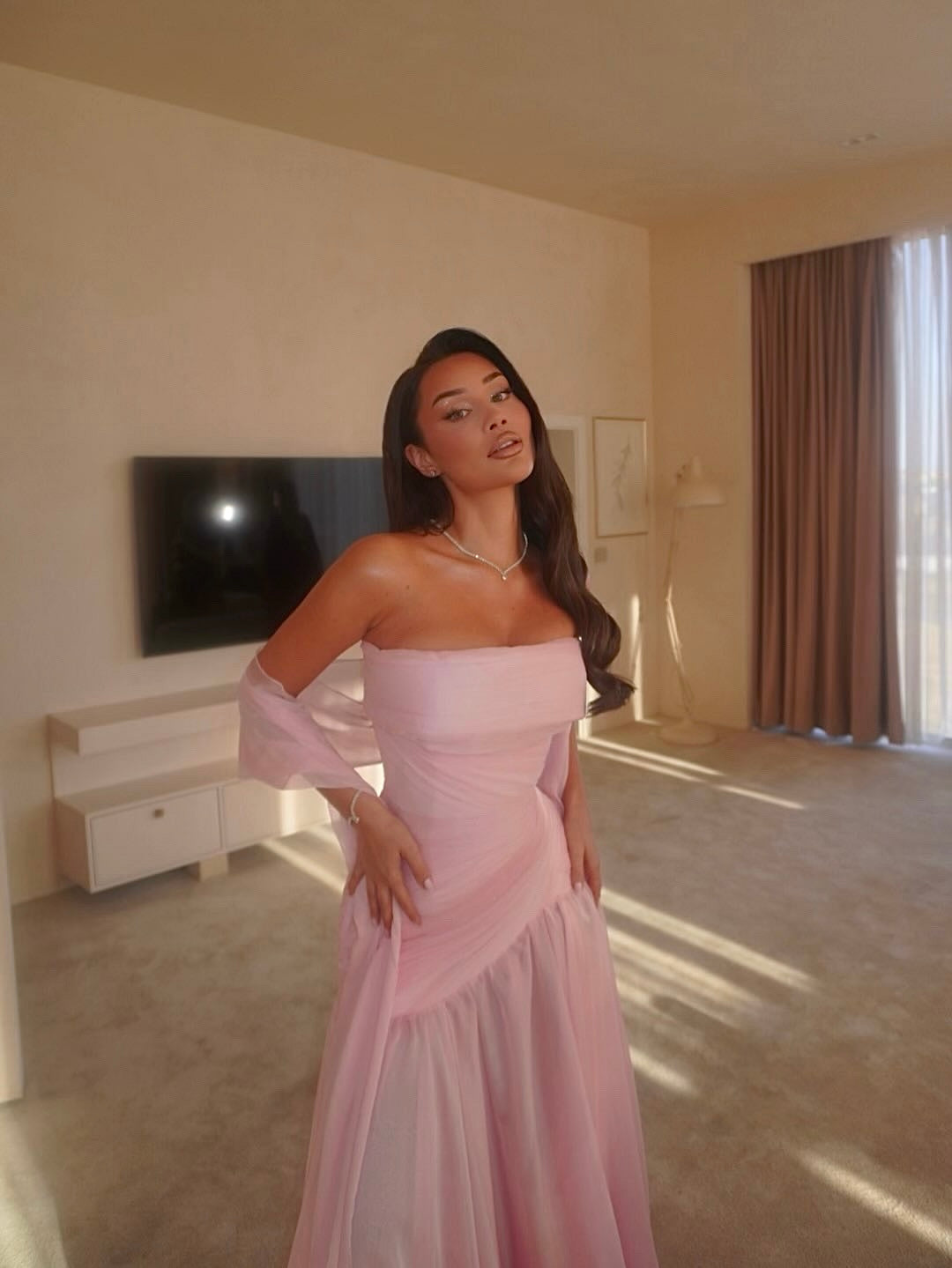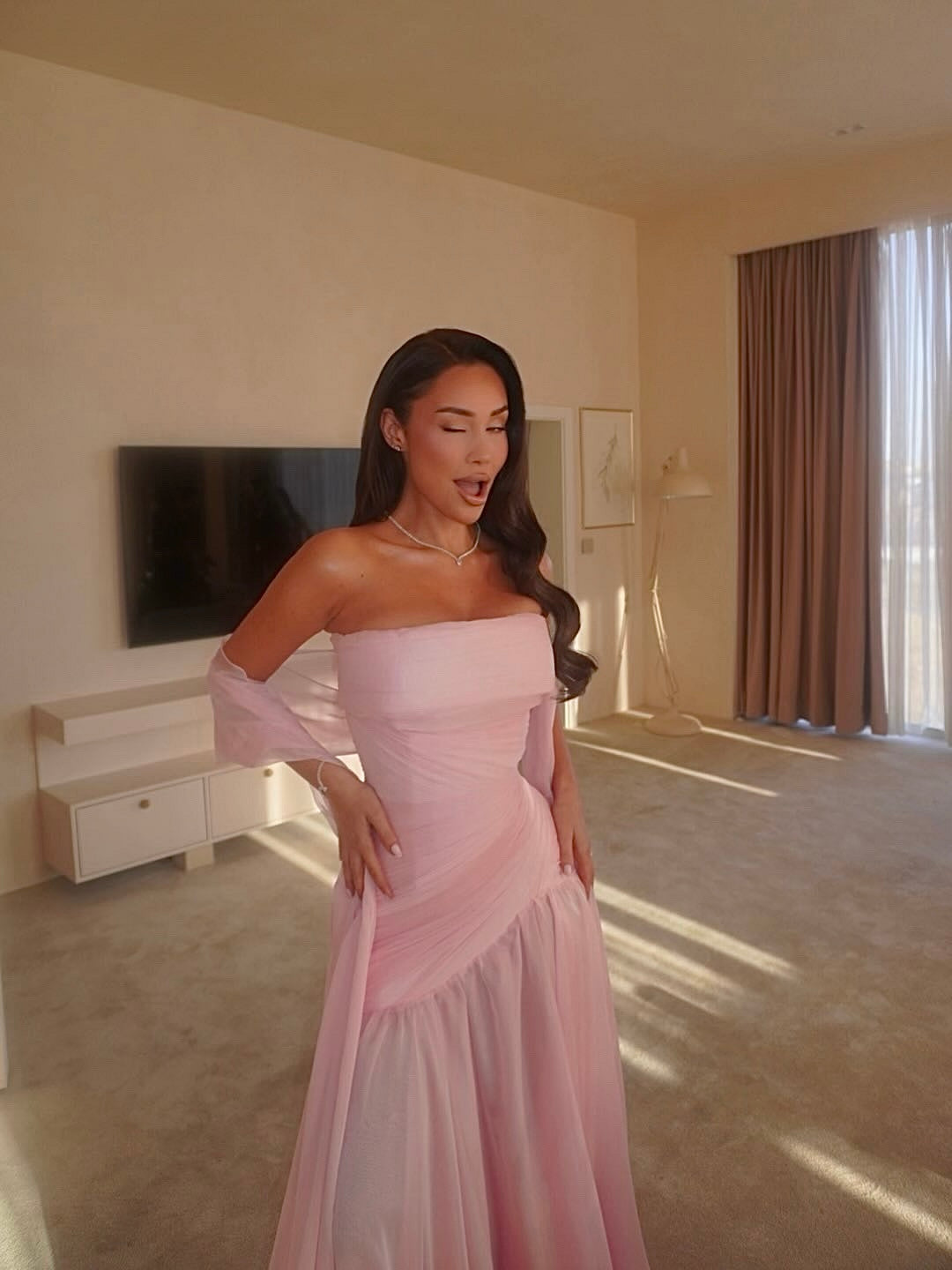 - Off‑shoulder neckline with delicate pleating that frames the collarbone