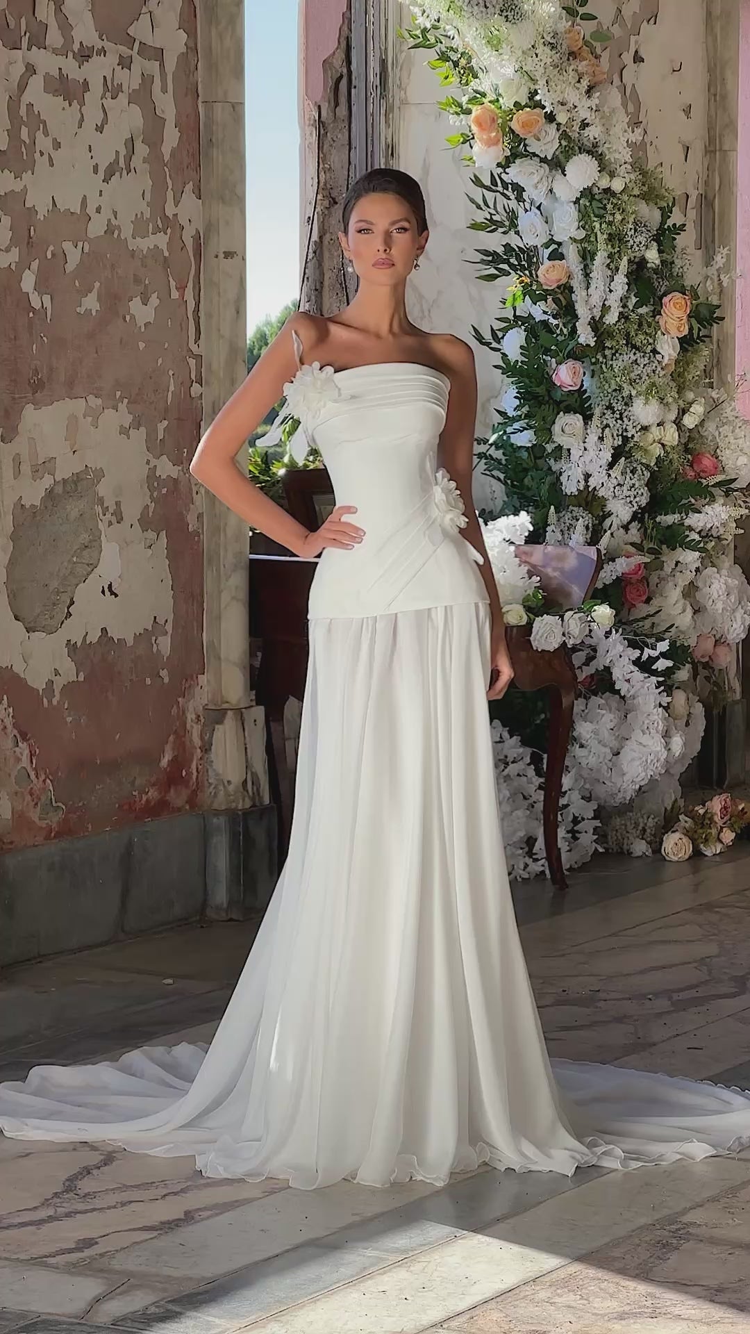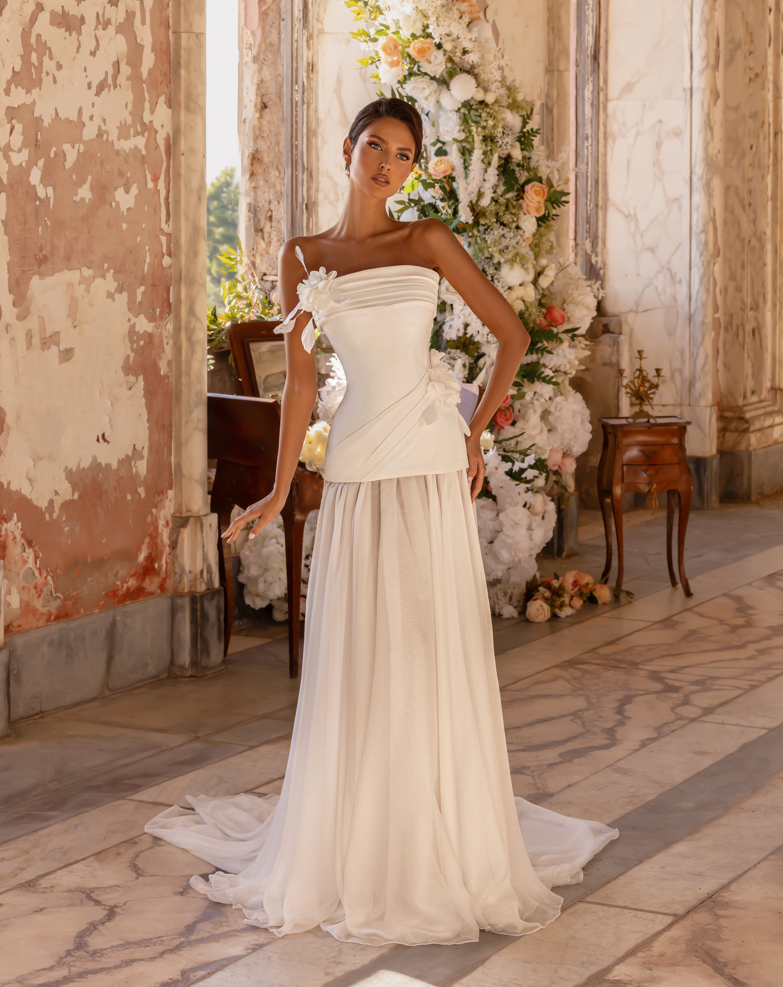 - Draped bodice with 3D floral appliqués