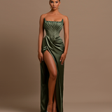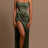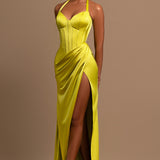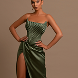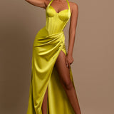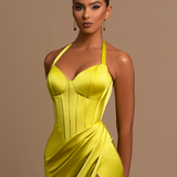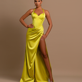 The Lime Corset Dress features a beautifully fitted bodice with a delicate tie closure, accentuating your curves in all the right places. The lower part of the dress features graceful draping, and a sultry opening on the left side adds a touch of allure....- $477.00