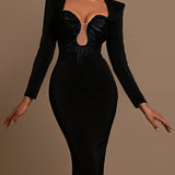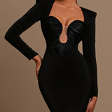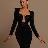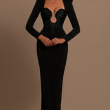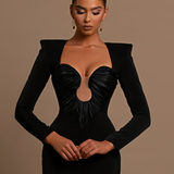 The Black Corset Dress is a stunning and classic piece that is sure to make a statement at any event. The dress features a beautifully structured corset with delicate draping, creating a sleek and sophisticated look. The long sleeves add a touch of elegance,...- $455.80