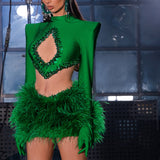 This stunning green crop top features a high neck and open chest design, adorned with intricate accessories, sparkling stones, and crystals. The long sleeves are finished with elegant feathers, adding a touch of drama to the look. The lower part of the top is...- $477.00