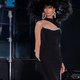 Introducing the "Midnight Spark" short black dress, a perfect blend of elegance and edginess. The dress features intricate silver beading that adds a touch of glamour and shine to the overall look. The sleeves are filled with feathers, creating a bold and dramatic effect...- $530.00