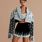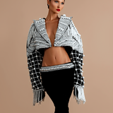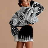 Mini Blazer Long Sleeves Shoulder Pads Deep V-Cut Handmade beads and fringes on the bottom of the dress and on the sleeves Model is wearing a size S- $996.40