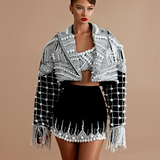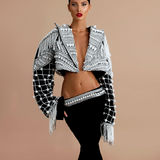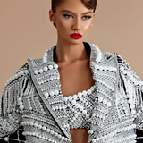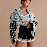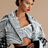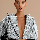 Three piece set featuring a short blazer, crop top and mini skirt Handmade blazer and crop top embellished with pearls and crystals Grid pattern on the sleeves of the jacket Mini skirt is also handmade decorated with pearl and crystal embellishments around the hemline...- From $392.20