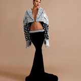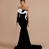 Black and white velvet gown Off the shoulder White overlay with embellishment on the front Front cut out Fitted Waist Long glove sleeves Mermaid Silhouette Floor length Model is wearing a size S- $1,452.20