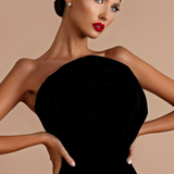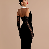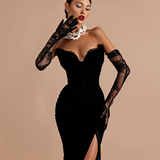 Strapless velvet gown Sweetheart neckline Corset with laces High Slit Long lace gloves Floor length Model is wearing a size S- $1,197.80