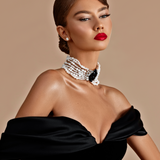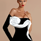 Black and white velvet gown Off shoulder Long sleeves Deep V-Cut Pearls on the sleeves Model is wearing a size S- $1,048.34