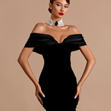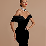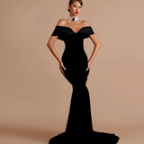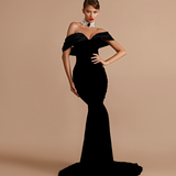 Long Dress Off the shoulder Sleeveless Fitted Waist Mermaid Silhouette Model is wearing a size S- $1,166.00