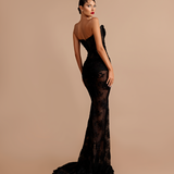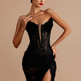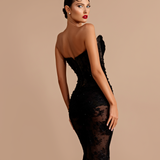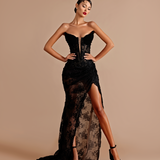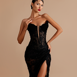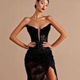 Strapless Semi-sweetheart neckline Deep V-Cut with tulle fabric underneath Embellished with beads throughout High Slit Black French lace Model is wearing a size S- $1,113.00