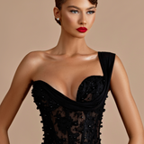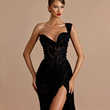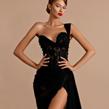 Black Dress Asymmetrical neckline One Strap Fitted Bodice Hide Slit Side Cape Floor length Embellished with beads Black french lace Model is wearing a size S- $1,240.20