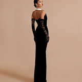 High Neckline Long glove sleeves Flower embellishment on one shoulder Fitted Waist Mermaid Silhouette Backless Floor length Black French Lace Model is wearing a size S- $1,176.60