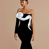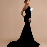 Black and white gown One off shoulder sleeve Floral design on the front Mermaid silhouette Floor length Model is wearing a size S- $1,399.20