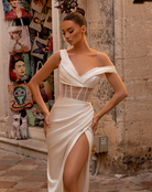 This clean and light satin wedding gown is the epitome of modern elegance and simplicity. The dress features a corset with tulle mesh, creating a unique and modern twist on a classic design. The corset accentuates your curves, creating a stunning and flattering silhouette that exudes femininity and grace. The dress has an open leg, adding a touch of sensuality and sophistication to the overall design. The satin material is light and airy, allowing you to move and dance freely without feeling weighed down. The clean and simple design of the dress makes it perfect for any type of wedding, whether you're having an intimate ceremony or a grand celebration. With its minimalist and understated style, this dress is perfect for any bride who wants to feel beautiful and confident on her special day.