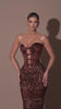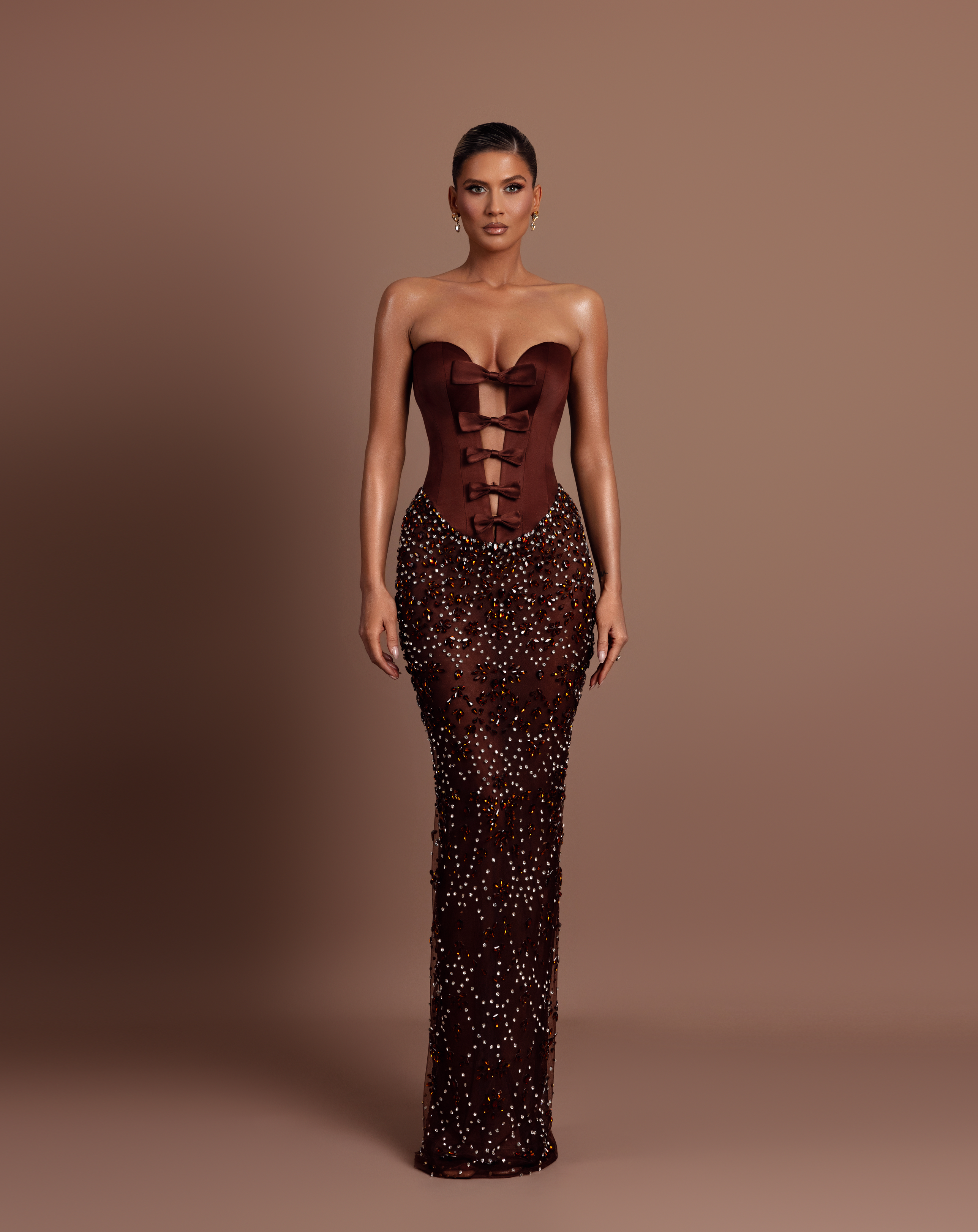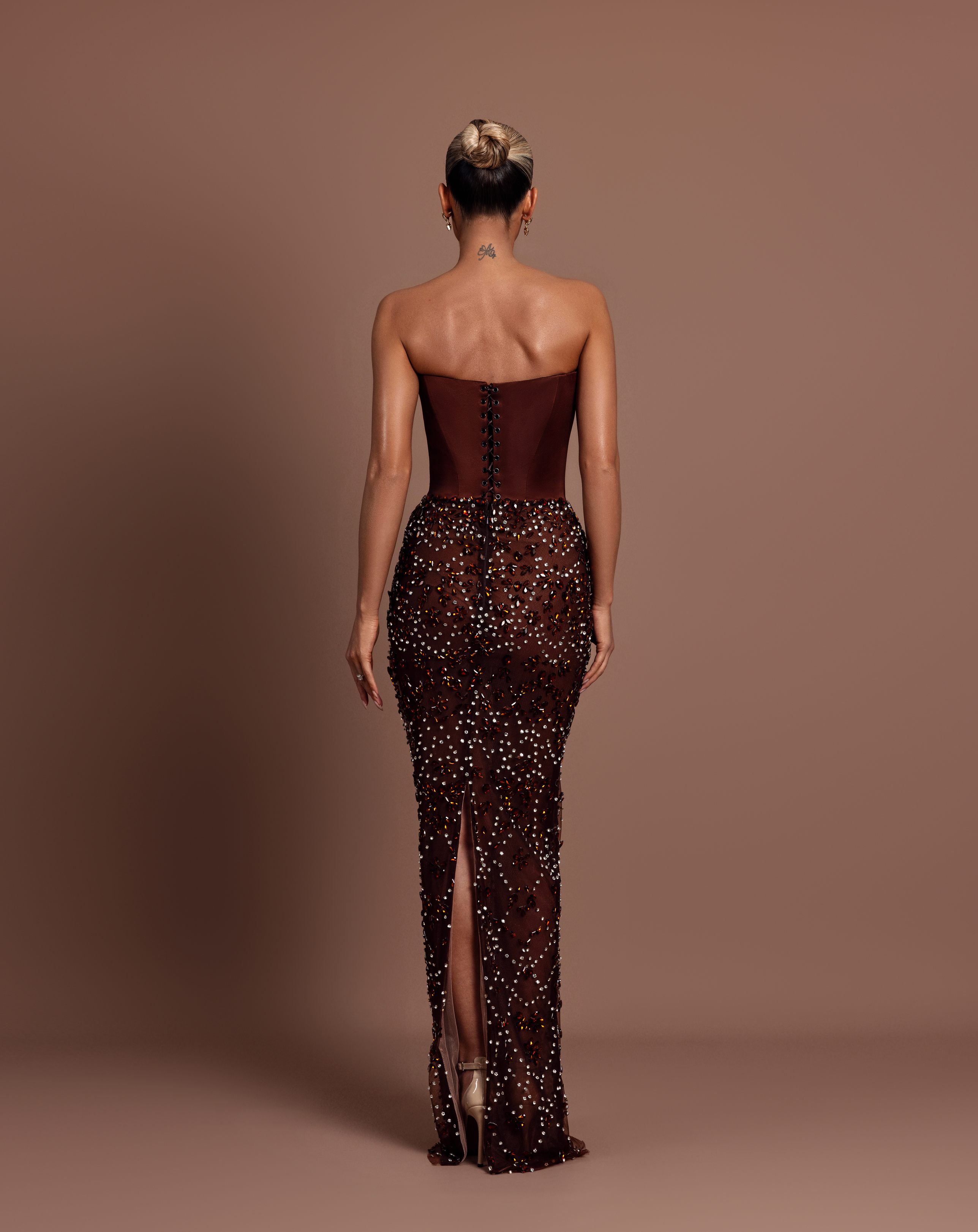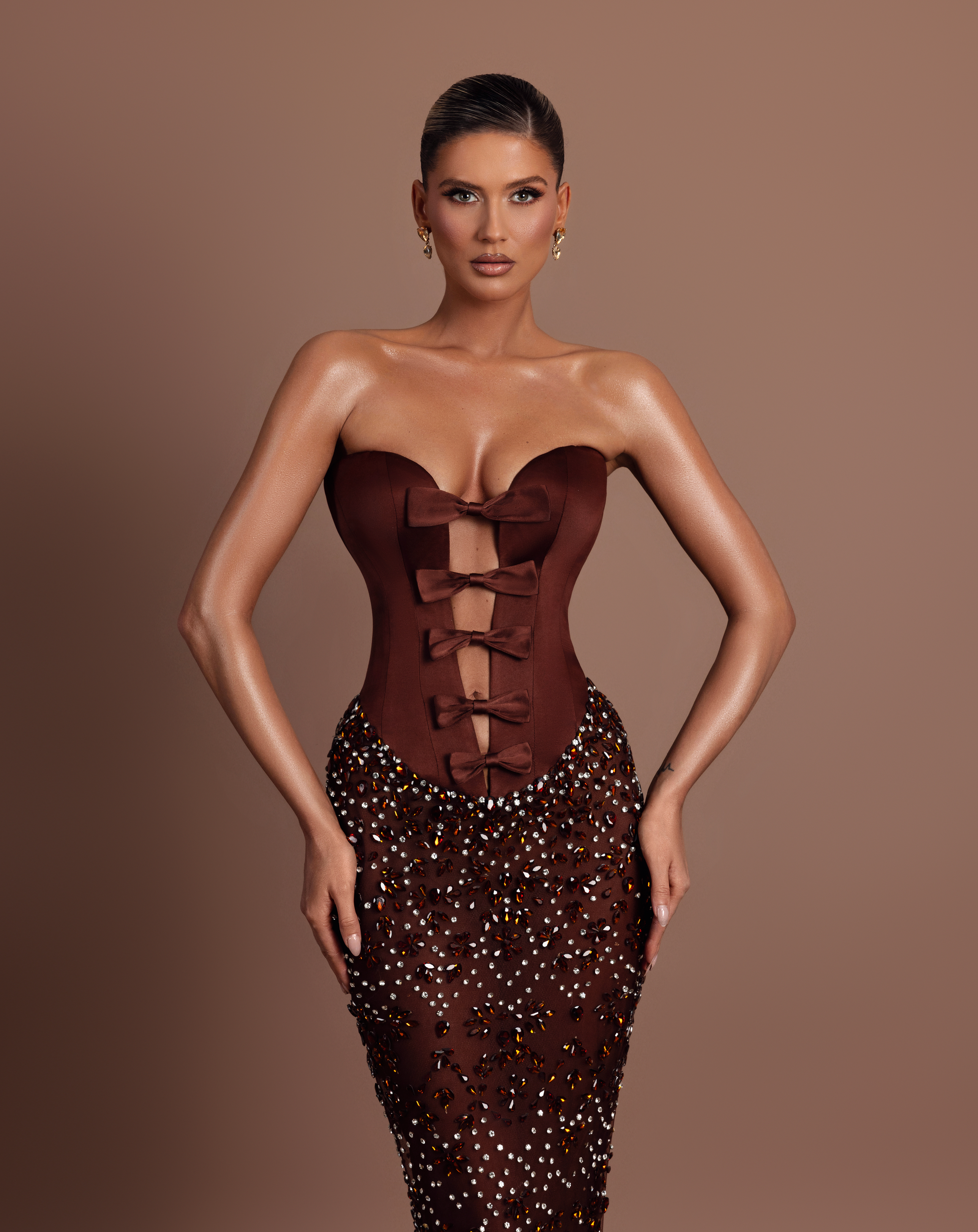 - Brown strapless satin corset with a sculpted fit