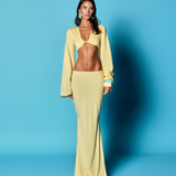PRE-ORDER ONLY! Two-piece printed ensemble in deep navy and ivory hues Halter style wrap top with asymmetric neckline and open back Flower brooch accent at the hip High-slit maxi skirt with flowy silhouette Model is wearing a size S- $561.80