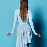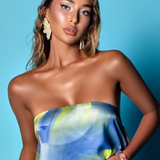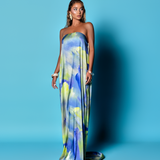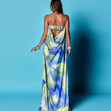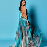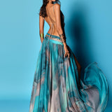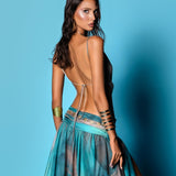Long ombré dress in shades of teal, sand, and seafoam Plunging V-neckline with twisted knot detail at the waist High leg slit with gold chain accents Flowy chiffon fabric Crystal embellished waistband detail Bareback with side cut-outs Mannequin is a size S- $508.80