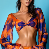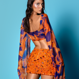 ESTIMATED DELIVERY TIME 2 MONTHS! Two-piece set in orange and purple sunset tones Abstract printed chiffon top with flared sleeves and front twist detail Orange mini skirt fully hand embellished with mixed sequins and stones Model is wearing a size S- From $148.40