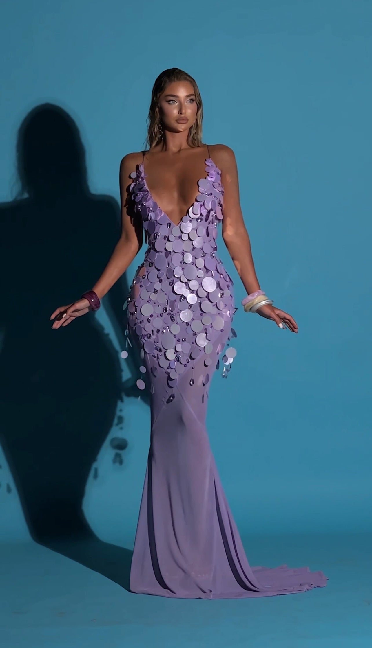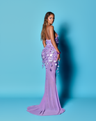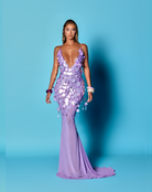 - Floor-length mermaid gown in a soft lavender hue