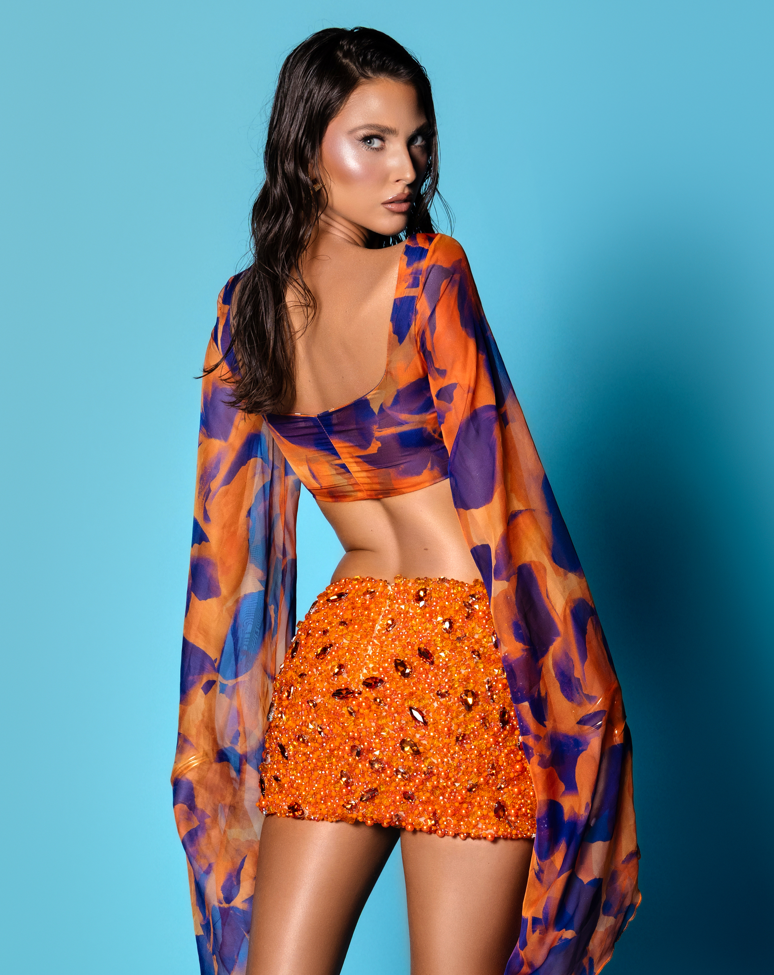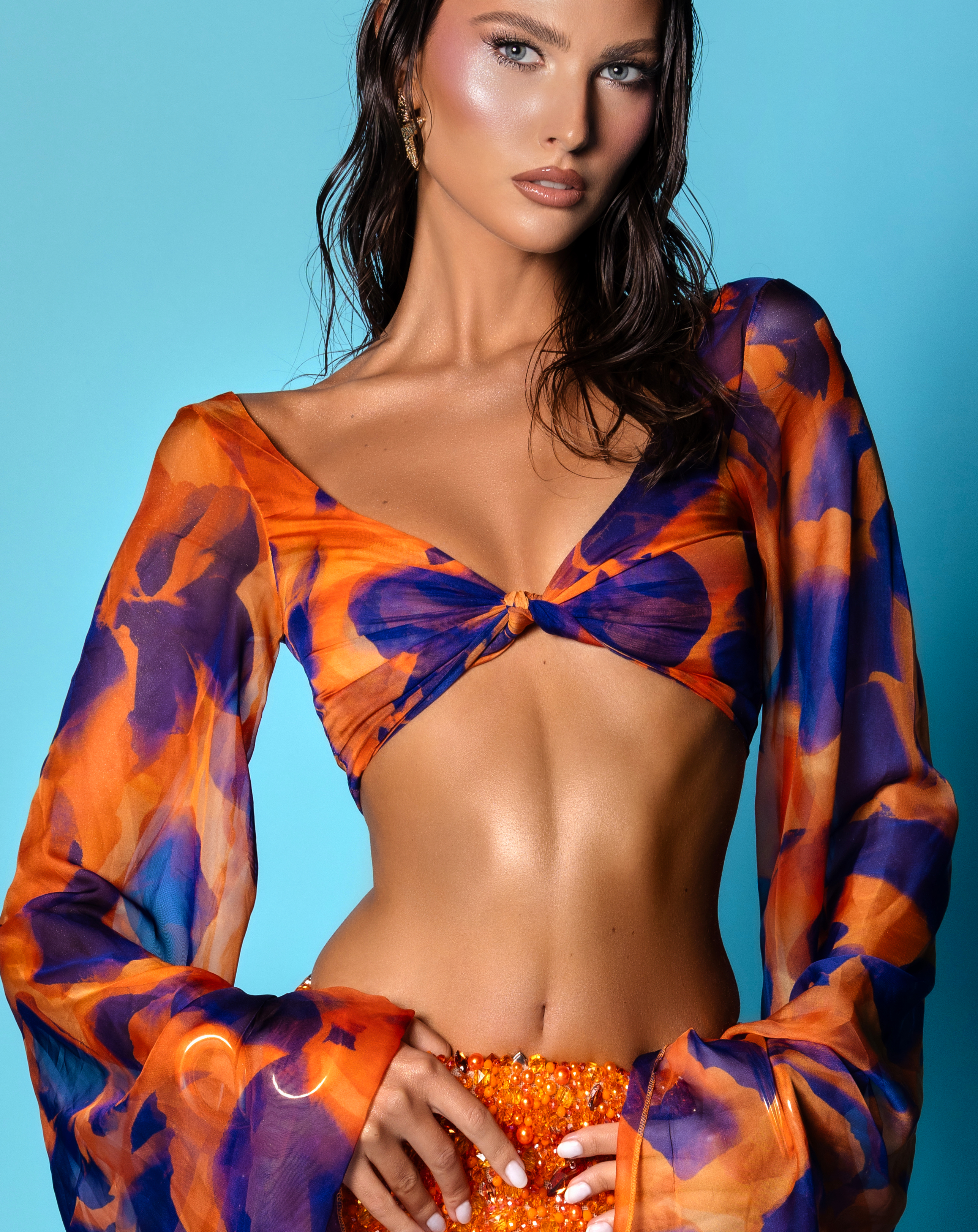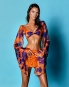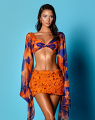 - Two-piece set in orange and purple sunset tones