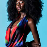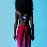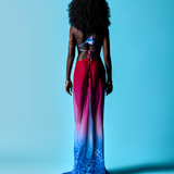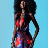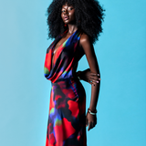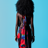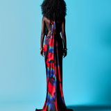 Long Dress Halter Neckline with tie at the back Backless Flowy skirt Rich hues of red, black, and blue blend in an abstract, watercolor print Model is wearing a size S- $291.50