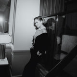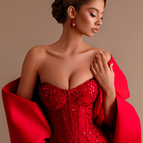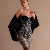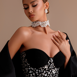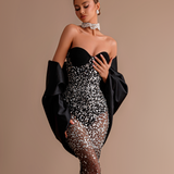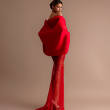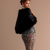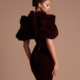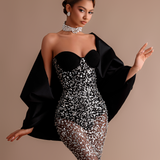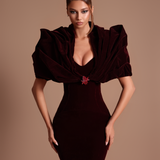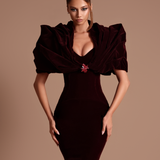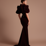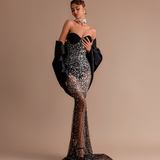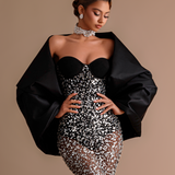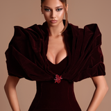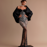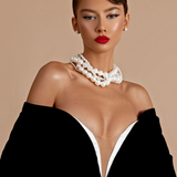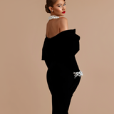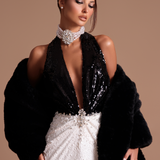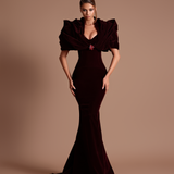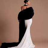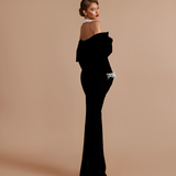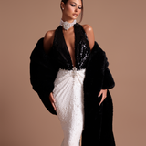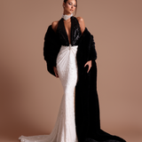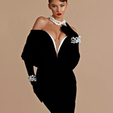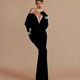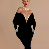Black and white velvet gown Off shoulder Long sleeves Deep V-Cut Pearls on the sleeves Model is wearing a size S- $1,048.34