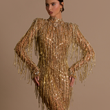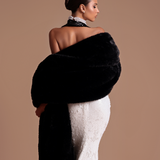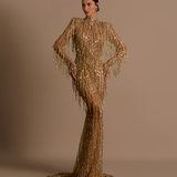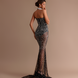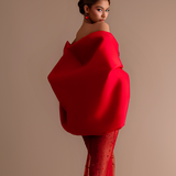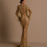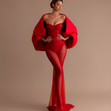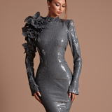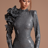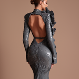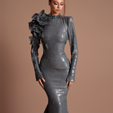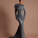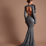 High Neckline Long glove sleeves Flower embellishment on one shoulder Fitted Waist Mermaid Silhouette Backless Floor length Black French Lace Model is wearing a size S- $1,176.60