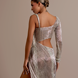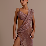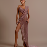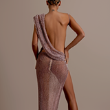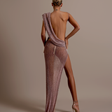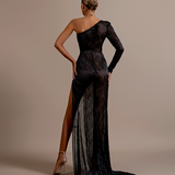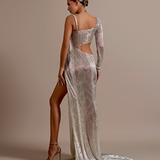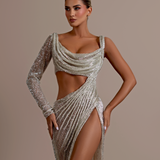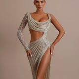 Asymmetrical design with one long sleeve on the left and a sleeveless right side. Draped fabric creates a cowl neckline Cutout at the waist and under the bust on the right side High slit on the right side Floor-length skirt with a slight...- $1,987.50