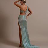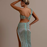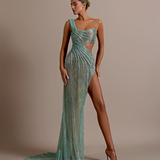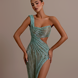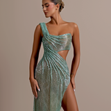 Shimmering aqua green gown Asymmetrical design with one shoulder strap Draped bodice creating a wrapped effect Cutout detail at the waist High slit on the right side Floor-length skirt with a slight train Draped fabric flows from the waist Form-fitting silhouette Open back...- $1,828.50