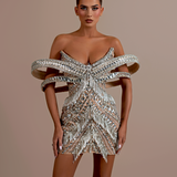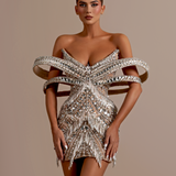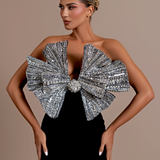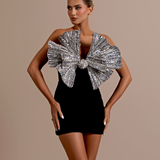 Black and silver mini dress Strapless neckline, accentuating the shoulders and collarbone The standout feature is the large, elaborate bow at the bust, intricately detailed with shimmering silver sequins Form-fitting silhouette Model is wearing a size S- $1,248.15