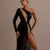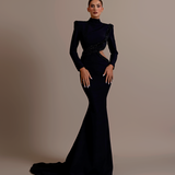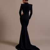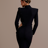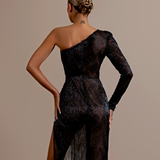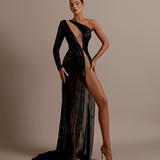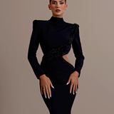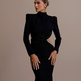 Long Black Dress High neckline Long sleeves Asymmetrical design with a cutout on the left side of the waist Embellished with intricate black beadwork that wraps from the left shoulder, across the bodice, and around the cutout. Structured shoulders Form-fitting through the hips...- $1,908.00