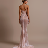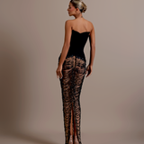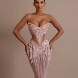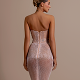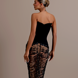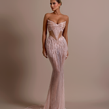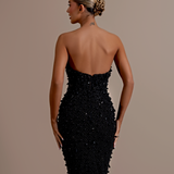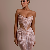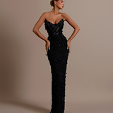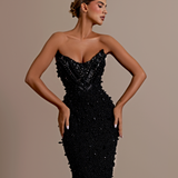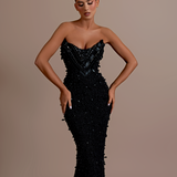 Strapless design Plunging sweetheart neckline Upper part made from a smooth, matte material Lower part adorned with intricate black beadwork and sequins over a sheer base Form-fitting silhouette Structured bodice Straight fitted Model is wearing a size S- $1,033.50