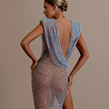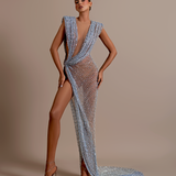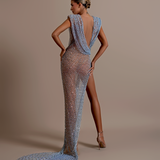 Long Dress Sheer, mesh-like fabric Plunging V-neckline that extends to the waist Sleeveless design with wide shoulder straps Asymmetrical draping across the bodice and waist Deep V-neckline Form-fitting silhouette High slit on the left side Floor-length with a slight train Deep V-back, exposing...- $1,590.00