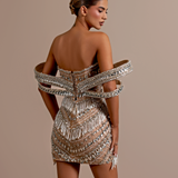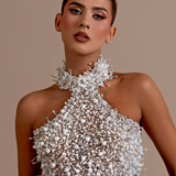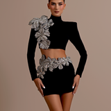 Black short dress Adorned with intricate beading and embellishments High neckline with a cutout at the chest Long sleeves, fully covered with detailed beading Fitted through the bodice with a mini length Unique cutouts at the midsection, connected by embellished strips, highlighting the...- $1,192.50